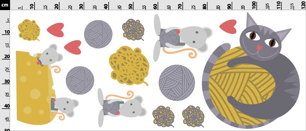 kočka s klubkem a myškami