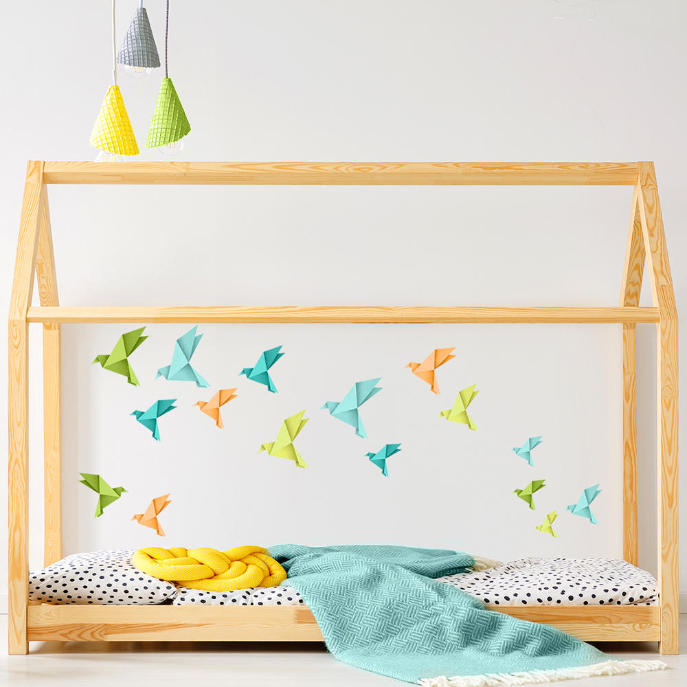 Origami ptáčci - oranžové, zelené a modré - nálepky na zeď
